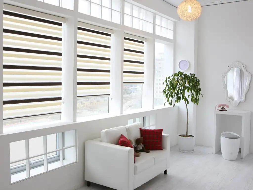 Один из самых популярных дизайнов рольштор – это модель «День-Ночь», или рольшторы «Зебра». Изделие состоит из двух полотен ткани, которые образуют горизонтальные полоски. Одна из них полупрозрачная, другая – более плотная. С помощью специального механизма полотна смещаются относительно друг друга. Прозрачные участки чередуются с плотными, и свет равномерно проникает в комнату. Когда темные полоски закрывают все прозрачные участки, образуется сплошное полотно, и помещение становится защищенным от света.